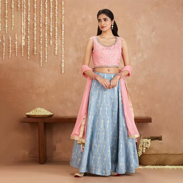 Pink and Blue Crop Top With Skirt and Dupatta